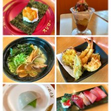 お寿司🍣色々 冬の山海天ぷら🍤 貝だし塩ラーメン🍜 チョコとピスタチオのパフェ🍨