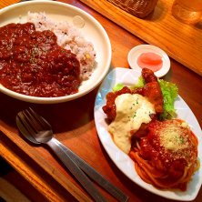 「エビエビエビエビオムライス」ですw 夢のようなメニュー♡でもこれは序の口で、もっとすごいのもあります(;・ω・) サラダバー&スープバーあり♪ 内装も変わっててジブリ風??な感じで楽しい!