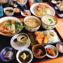 クジラウォッチングの後、お腹が空きすぎて欲張りランチ(^-^) ソーキそばとトンカツのセットに付いてくるクーファジューシーはボロボロジューシーに変更、ゆし豆腐はみんなでシェア・・・ なんてユルユルに食べたいものを注文したら、 お膳が大変なことに!!! 満腹すぎて、う、動けない〜!