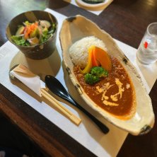 「常滑やきもの散歩道」にある『常滑屋』で遅めのランチ ・ハヤシライス ・サツマイモと人参のサラダ ・ラズベリーのムース ワインゼリー添え 右下はメニュー、厚めの板に手書き(?)されてます。 看板メニューの「常滑ちらし」が食べたかったけど売り切れ…残念。。。 けど、ハヤシライスもメチャうま〜(^^)