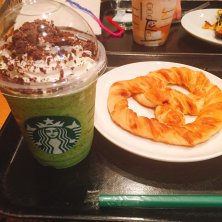 スタバで話題のカンタロープメロンではなく、 CBMCF 550円にしました* (チョコレ-トブラウニ-抹茶クリ-ムフラペチ-ノ) 最後までCBたっぷりMも濃厚!美味でした! お供のプレッツェル280円は焼くとサクサク香ばしい ご馳走さまでした(^o^)/
