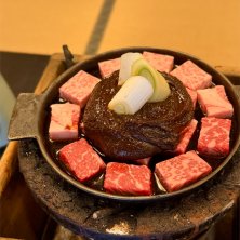 牛鍋 🍲 手前のお肉が普通の「ぶつ切り牛鍋」 奥側のお肉が「ぶつ切り特上牛鍋」 甘いお味噌がこってりおいしい✨️