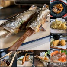 鮎茶屋かわせ 鮎の専門店ですよ ここはほんまに美味しいんです 鮎の塩焼き 290円 ✖️ 8 なんぼでも食べられます 肝までうまいです^_^ 鮎の刺身 550円 鮎のせごし 550円 小鮎の天ぷら 550円 子持ち鮎甘露煮 650円 美味しい鮎は苔の色で緑色ですよ^_^