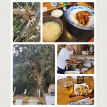 ジジババ連れてプチ観光 高岡神社の御神木(平安杉・昇り龍) 確かに龍に見える 行きがけに昼食 鰻、注文してから生簀から上げて それから割いて焼き 🐙唐揚げとビールでゆっくり待ち 鰻は期待したけどそれ程では無かった