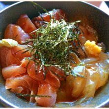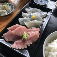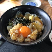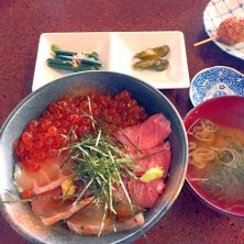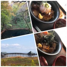 またまた青森に来ております〜お昼は エンガワ付きヒラメ漬け丼 ヒラメ漬けとユッケのハーフ&ハーフ丼 目の前の海を見ながらいただきました〜 鶴の舞橋と白神十二湖の青池 今日は日中、暑いぐらいでしたね〜