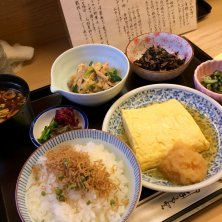 ちりめんじゃこ付きセット🥢 天丼やとんかつのお店は大行列ですが、こちらはゆったり空間で行列店に引けを取らないランチを堪能できます✨ お出汁をたっぷり含んだだし巻きにほっこり優しい味わいのおばんざいは今回も絶品でした☺️