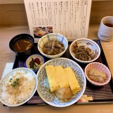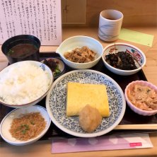 お昼のセット ちりめんじゃこ付き😃 お久しぶりにこちらでだし巻きと京のおばん菜セットを頂きました✋ いつものことながら、主役のお出汁たっぷり含んだだし巻きはもちろん赤だしや漬物も手抜きのない美味しさでほっこりします☺️