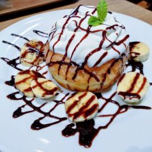 ふわふわのドーナツに たっぷりのクリームがライドオン その周りをバナナがサラウンドして チョコソースをたっぷりかけた "ホイップドーナツチョコバナナ" 🍫チョコと🍌バナナなら 鉄板じゃんね