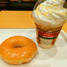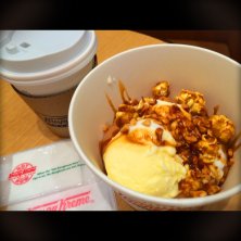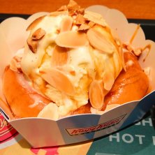 週末に食べた「クルクルバニラ キャラメル ソルティナッツ」という、オリジナルグレーズドドーナツにバニラアイスクリームを乗せて、キャラメルソースをかけたもの!#mitafull