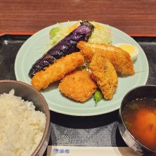 いつも飲み使いしてる楽市で初ランチ🍴 お魚が美味しい楽市だから刺身定食と悶絶悩んだ末に「魚のフライ定食」🐟 刺身は夜ちょいちょい食べてるしね。 エビフライ🍤 たらカツ🦈 タコメンチ🐙 カキフライ🦪 間違いない美味しい♪