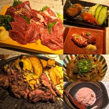 あばれ馬コース 馬刺盛合わせ、馬すじの煮込み、馬コロッケ、馬肉の鉄板焼グリル野菜添え、馬のにぎり寿司、デザート せっかく熊本に来たので、宿泊代をケチった代わりに