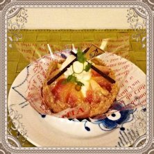 本日のデザートは、 フルーツパニエで~す(^○^) しっとりとしたアーモンド生地の上に、カスタードクリーム、生クリームと詰めて、フルーツをたっぷり乗せました。 カスタードは、フルーツに合わせて、軽い風味に仕上げ、フルーツも盛りだくさんに仕上げた、フルーツが主役のケーキとなっております。 今日は、ディンブラティーをアイスで、頂きます(^^)d それでは、 ボナ・ペティ♪