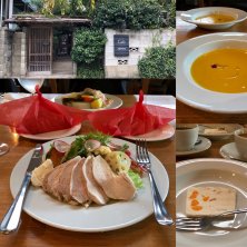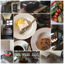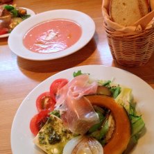 今頃になりましたが、今日は友人とランチ。 隠れ家風の古民家レストランで、素敵なひととき。 手前は私の頼んだサラダランチ。自家製パンとデザートとコーヒーつき。メインがサラダなのにお腹いっぱい! 奥の皿は、友人が頼んだスープランチのスープ。今日はトマトとジャガイモの冷製。