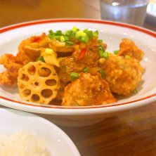 紅虎餃子房でのランチ 茄子と豚バラの土鍋ご飯です。 茄子、豚バラ、筍、白菜、キクラゲ、マッシュルームが入ったあんかけはアツアツでGOODでした。 これで¥880はリーズナブル。(^^)