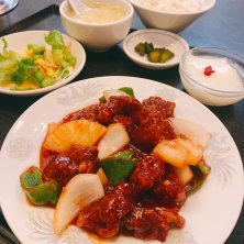 酢豚定食🐖 お昼過ぎまで少し仕事。その後、行ってみたかったお店思い出して行ってみたら凄い待ちみたいで諦める。定食が良いなと思っていたので、久しぶりにこちら。3年ぶり⁉︎🫢 酢豚一口食べて、1週間前も甘酢のランチ食べたのを思い出す😓 https://miil.me/p/kdexg パイナップル🍍入りで、タレもケチャップの甘酢っぱい昭和の酢豚。懐かしい感じ。 そして、行きたかった店は同じ建物の2階だったのに気付く😂💦一階のカフェに、皆待ってたみたい。。