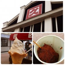 八丁味噌の郷で工場見学☆ 赤だしと八丁味噌で味噌汁の味比べして串カツを試食いただきました(*^^*) そして八丁味噌ソフト…コレは食べなきゃ! うん、味噌の味するソフトクリームやね(^^;;