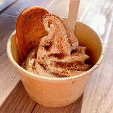 カクキュー八丁味噌 味噌ソフトクリーム 450円 クリームに味噌を練り込み、八丁味噌のパウダーをふりかけ、味噌せんべいをトッピングしていてまさに味噌尽くし。塩キャラメルのような風味で大人気です。
