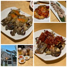 娘たちが行きたがっていた食べ物編〜 こちらはカンジャンケジャンで韓国🇰🇷でも有名なお店のようでした〜初訪問😊 お店の方々はお忙しいそうな中とても親切に対応してくださりうれしかったです🎶 カンジャンケジャンや辛口ケジャンは初めて食べましたがインパクトありましたね〜 待ち合わせて伺う前に日枝神社を通ると桜が🌸満開の鳥居⛩とお月様にうれしくなりました😊