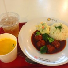 ハッシュドビーフ 肉が多少アレですが(まー安いからね)トマトの酸味と玉ねぎの甘みが美味しいソースです。 セルフだし安いおにぎりやペットボトル販売なんかもあって使い勝手がいいので空いてる時期は寛げるお昼所として良く利用してます。 奥のヤコブセン椅子もただで座りまくれますw