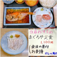 <まぐろや定食 ¥1,100 + マンボウの刺身 ¥300 (税込)> 熱海駅前の水産会社直営店、初訪です。11:00am開店の10分前到着で24人待ち。GW客で混み、自分もその一人。カウンターのみ25席程にまだ感染防止で席の間隔を開けていて1順目に入れず40分待って入店。金目鯛一尾丸ごとの煮付けと刺身がついて驚異的な値段のまぐろや定食、金目鯛は小さめですが、十分満足♫ ご飯大盛りも無料。珍しいマンボウの刺身は初食、フニャコリ食感で淡白な美味しさ、肝付き。顧客対応もよくいいお店を見つけました!