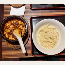 元祖頂天石焼麻婆豆腐刀削麺小辛1080円 豆腐はお店の人が崩してくれる 石焼なので煮えたぎっている 小辛なので抑えめな辛さ 刀削麺は歯応えありでおいしい れんげが大きくてちょっと食べにくい 唐揚げとスープ、キャベツ千切り、杏仁豆腐がつく