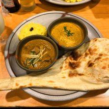 神田カレー街スタンプラリー 13店舗目 インドレストランマンダラ(神田神保町)にて、 Holiday LunchのCセットのダブルカレー(1760円) マトン、ダールマカニ(豆3種🫘) 今日は別の店へ行こうとしたら日曜日お休み😱 神田界隈の土日休みの多さよ…気を取り直して後日行く予定だったマンダラへ。 ナンがもちふわ!熱々で出てきます。ダールうま!マトンうま!満腹でタンドリー無しでも良かったかも…最後に追いフルーツライタも。結構量多い😂 インドカレーやっぱり大好き!