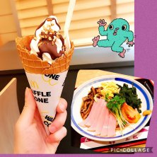 マクドナルド🍔 ✽ワッフルコーン 全部のせ 気になっていたワッフルコーンの全部のせ🙌🏻 思ったより乗ってなかった😂 店舗によって当たりハズレありかも*笑 ランチはお店ごはんで和風冷麺🥢 麺がお蕎麦になってました。 『麺がゴムみたいで美味しい!』というと 友人にそれ褒めてるん?って…😳 (語彙力の乏しさ) 弾力のある麺が正解だそう。