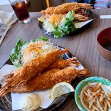 お昼ご飯(3/4 14:20) 【特大えびフライ定食】 大幸商店 兵庫県豊岡市城崎町湯島130 びっくりする位🍤🍤🍤大きい特大えびフライに😍感激 食べるのが大きくてたまりません😁