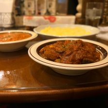 ランチセット。チキン、シーフード、野菜のカレー三種類!シーフードは海老の味が濃かった!ナンは冷めてもんまい