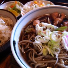 中華ざる。普通の蕎麦つゆにラー油が入っているのでピリ辛。 奥に見えるはミニかつ丼。