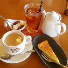 2017年10月8日(日) ドリンクに一個デザートが付く1日中サービス有り☆ミニチーズケーキと白玉ぜんざいを選択☆ドリンクはアイスティーとカフェオーレ各390円☆アイスティーはポットなので約2杯分~コスパ高い!