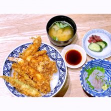 旦那と来ました。 大丸へ来ると、いつもここになってしまう。 ランチセット 海老2本、南瓜、ピーマン、サツマイモ、小えびのかき揚げ、帆立 お味噌汁 やっぱり美味しい〜 お腹いっぱいになってしまった、、