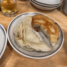 箸で持つと「重たいっ!」 絶対 一口では食べられない餃子、焼きたて熱々。井之頭五郎さんみたいにたっぷり胡椒とお酢で食べたら これがなかなか美味しかった♪