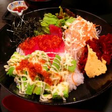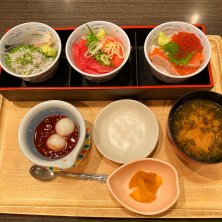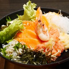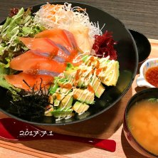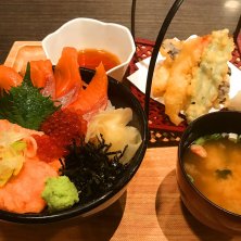 サーモンづくし丼と天ぷらのセット この土日ろくにご飯食べてなかったので 気分転換に買い物も兼ねて外でご飯( ˙ ꒳ ˙ ) 店前のメニュー見てて サーモンと天ぷら!!素敵!! とひょろっと入店しました。笑