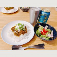 お夕飯。 サラダ。オットお土産のキーマカレー。 今日はモコトリミングとわたしのヘアカットと縮毛矯正が、そうでもないとのことで違うストレートにしてカラーもしてきました。満足です〜