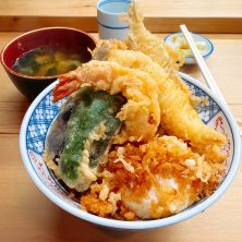 そして〆のご飯。丼飯サイズで完食タイヘン。上には玉子の天ぷら。しょうゆとたれが選べ、これはたれ。カウンターに置いてある七味かけると旨さ増します。