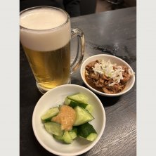 ビールとおつまみたち〜 きゅうり🥒 鶏皮煮込み おいし〜