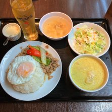 ガパオライス 鶏グリンカレーセット サラダ、スープ、飲み物、タピオカデザート、ライスおかわり付き 1000円 新宿に用があり金曜に2年ぶりに行った🚃 私は一度もガパオライスをレストランで食べたことがなかったので今回日本でタイ人が作っている店に行きたかった🇹🇭 ネットで調べてロータスラウンジ新宿へ行った🔍早めに行ったので空いていた カレーは🍛 HOT 鶏グリンカレー spicy エビレッドカレー mild 豚イエローカレー の中から選べる ⏬