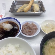 久しぶりの天ぷらひらお!!! 名物、イカの塩辛は食べ放題です\(//∇//)\ 揚げたての海老、イカ、鳥もも、メヒカリ2、なす、かぼちゃ、ピーマンを大根おろしたっぷりの天つゆで♪ この定食で770円。コスパ凄い。 帰りに天かす貰いました(^^)