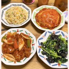 今日は金春(コンパル)でテイクアウト、ここは天津飯が甘酢あんなので選ばれました〜😆 我が家の中華皿を総動員🐰 炒飯皿には炒飯 万能皿には天津飯 焼売皿には青菜&きくらげ炒め 海老チリ皿には酢豚 天津飯と酢豚で甘酢欲が満たされましたー! 本当は肉団子が食べたかったけどここには無し
