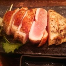 で、私はこっちの大山鶏の刺身ステーキ定食♪ 刺身でステーキ?と、前回から気になってたメニューで、出てきて納得! ほぼ、中はレアです(๑><๑)۶ 表面だけしっかり焼いてあって、中は生です! でも、すごく美味しかったです(≧∇≦) このお店で、ただ一つ気になるところは、付いてくるお新香が、極少なところです…あと、20円高くてもいいから、もう少し入れてくれるか、むしろない方がいいのでは?って感じです(^_^;) 極少ぶりは、部活でご紹介しますね~(^w^)