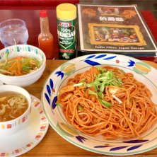 各国料理 24時間営業年中無休 元祖大宮ナポリタン ランチタイムはサラダとスープが付いて 950円税込 昔ながらのナポリタン、豚肉、イカ、玉ねぎ、ピーマン、マッシュルーム、水菜 凄いボリューム 旨旨!