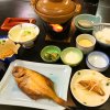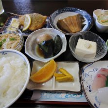 おまかせ定食。 アジフライ、カレイ煮付け、サラダ、素麺、ナスとジャガイモの煮物、冷奴、もずく酢、刺身、漬物、オレンジ。これで千円。