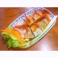 東京都新宿区 歌舞伎町に有る人気のタイ料理の店、タイ国料理 バンタイのポピアチーン。 タイの家庭料理の1つで挽肉、パクチー、カシュナッツ、春雨などの沢山の具材をライスペーパーで作られた皮で巻いて蒸したタイ風の蒸し春巻きの事で、辛さは無くてやや甘めの味付けのタレをかけて食べる料理で、レタス、人参、赤ピーマンとエシャロットが添えられております。 まるでベトナム料理でお馴染みの生春巻きの蒸したバージョンという感じでした。モチモチ食感の皮と色々な具材が甘酸っぱいタレに良く合って美味しかったです。