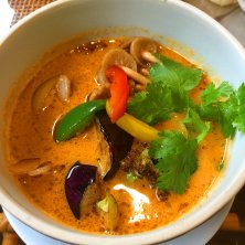 今日は用事があり、旭川に行きました。お昼はずっと気になっていたお店へ✨ここのグリーンカレーが食べてみたくて行ったのですが、1日10食限定と言う『スープラクサビーフ』と言うメニューを見つけ、聞いたらまだあると言うでそちらにしました❗トムヤムベースのラクサスープをスープカレースタイルにキャベツと一緒に煮込み素揚げ野菜はたっぷり8種類以上。ラクサは麺料理らしいですが、こちらはライスで頂きます。トムヤムクンが大好きなのでとっても美味しかった🥰
