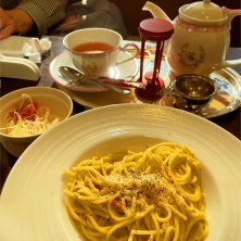 母とランチ 去年は断られた母のインフルエンザの予防接種。 無事に母のかかりつけ医で打てたので、久々に街中でランチしました🍝 デパートの中の珈琲店はほとんど貸し切り状態で、しかも日差しがポカポカ降り注ぎ、気持ちいい時間となりました。 リハビリがてら母を連れ回しましたが、ますます足が弱ってきているのを実感🥲 これから冬が来たら、転倒防止と筋力低下防止に頑張らないと❗️ ✴︎カルボナーラ ✴︎紅茶(イヴ) フルーツの香りがして美味しい紅茶でした😃
