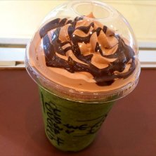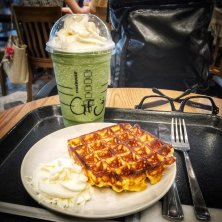 アメリカンワッフルと抹茶クリームフラペチーノ iPhoneのバッテリーがきびしくなってきたので充電しようと思ったらこの店はコンセント無しだったσ(^_^;)。まあ、こんなこともあるよね。