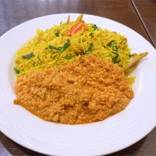 同店のメニュー「マトンビリヤニ」(たきこみごはん的ボリュームライス)に惹かれて来たけど、暑い夏に発汗を狙い、スープのないカレー「プローンエッグフライ」(1500円)を注文! インド人と思われるご主人の調理中から厨房よりスパイシーなたまらない香りが漂い、それでいて口に入れると程良き辛さが。えびとスクランブルエッグの舌当たりも良く、その絶妙な炒め具合が素材の甘さを引き出してます。常連になりたい!!