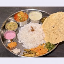 本日のランチはこちら🎵 ベジタリアンミールス サンバル ラッサム(パパドに隠れてます ダール 蓮根のコロンブ 何となく、ただ何となく スパイスの効いたカレーが食べたくなってしまい 辿り着いのが、こちらのお店