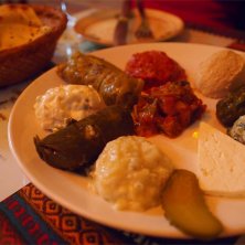 メゼ(前菜)とドルマ(野菜料理?)と白チーズの盛り合わせ。 茄子とヨーグルトのディップとか、唐辛子とトマトのディップとか、ブドウの葉で巻いた何かとか、元祖(?)ロールキャベツとか。珍しいものいっぱい。 しかもどれもおいしい。 最近下手すると家に缶詰で一週間喋らない生活なので、飲み会が楽しいです( ̄▽ ̄)